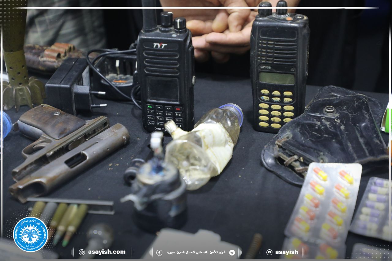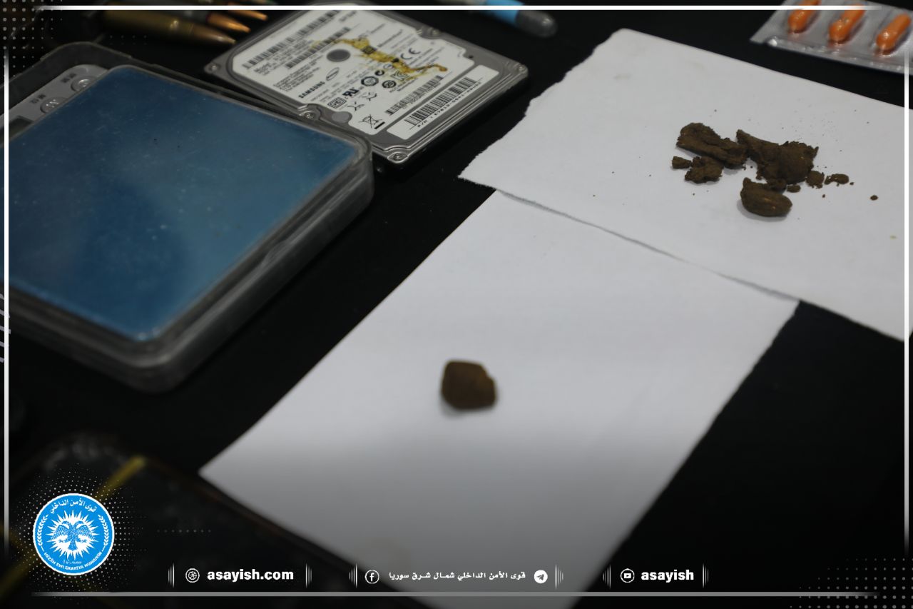 2.266 kg heşîş, 100 hebên madeyên hişber yên cûrbecûr, dozek metamfetamîna krîstal a ji bo karanînê amadekirî, du pîvanên elektronîkî, kîteyek narkotîkê, tabancayek, çarçoveya tabancayê, du çekên tûj, pênc cureyên guleyên cûda, topek hawanê, du walkie-talkie, 70,000 lîreyên Sûrî di banknotên sexte yên 5,000î de, û dolarên Amerîkî yên sexte.