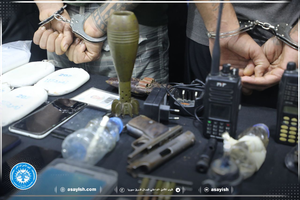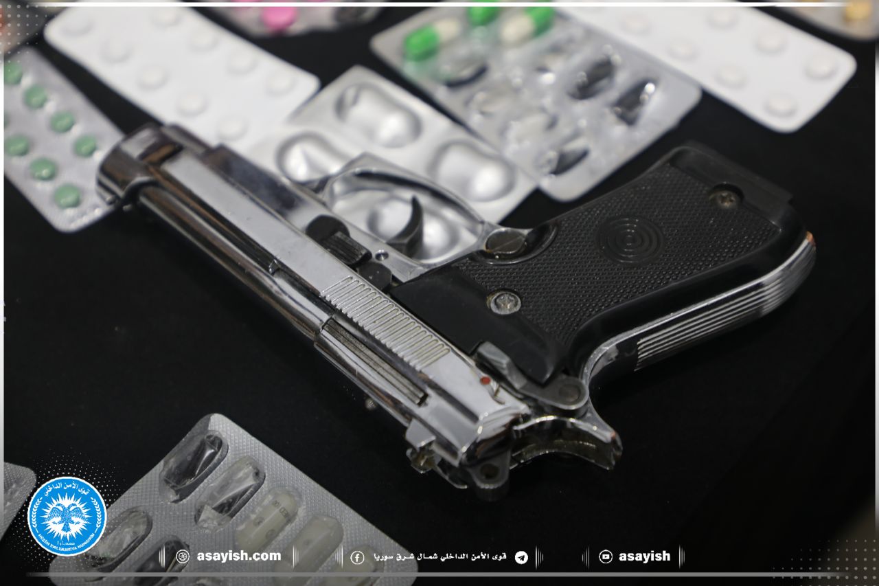 2.266 كيلوغرام من مادة الحشيش، 100 حبة مخدرة بأنواع مختلفة، جرعة من مادة الكريستال ميث مجهزة للتعاطي، ميزانين إلكترونيين، عدة تعاطٍ، مسدس، هيكل مسدس، سلاحين أبيضين، خمسة طلقات نارية مختلفة، قذيفة هاون، جهازين لاسلكيين، 70 ألف ليرة سورية مزوّرة من فئة 5000، و100 دولار أمريكي مزوّر.